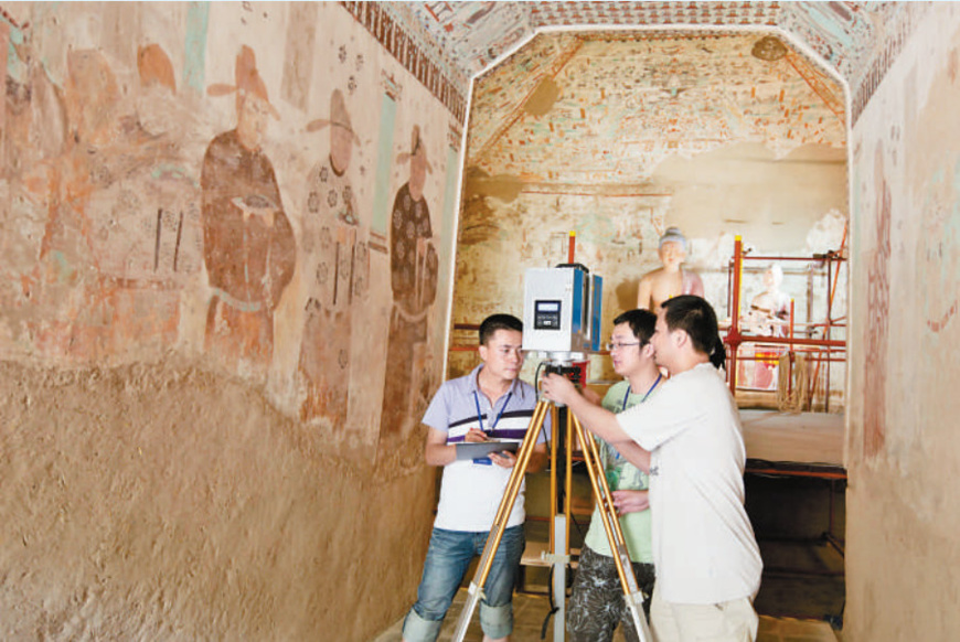 Huang Xianfeng (right) and Zhang Fan (middle), both researchers devoted to the preservation of Mogao Grottoes in Dunhuang, northwest China’s Gansu province, scan murals in a cave with a staff member of Dunhuang Academy China. (File photo)