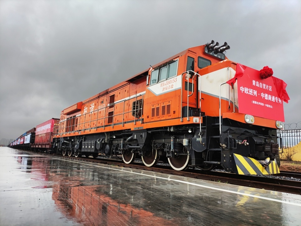 Photo taken on July 17, 2022 shows a fully loaded cargo train in a logistics park in the Qingdao Area of China (Shandong) Pilot Free Trade Zone. (Photo by Xue Bing/People's Daily Online)