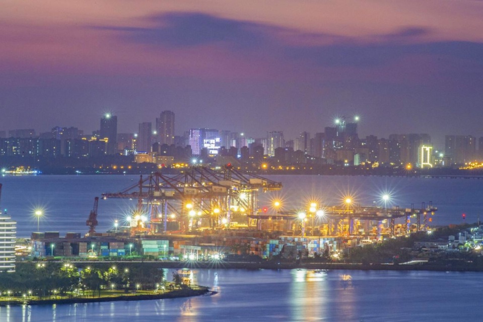 Containers are loaded and unloaded at a well-lit container terminal of Haikou port, south China’s Hainan province, Oct. 20, 2021. (Photo by Wang Chenglong/People’s Daily Online)