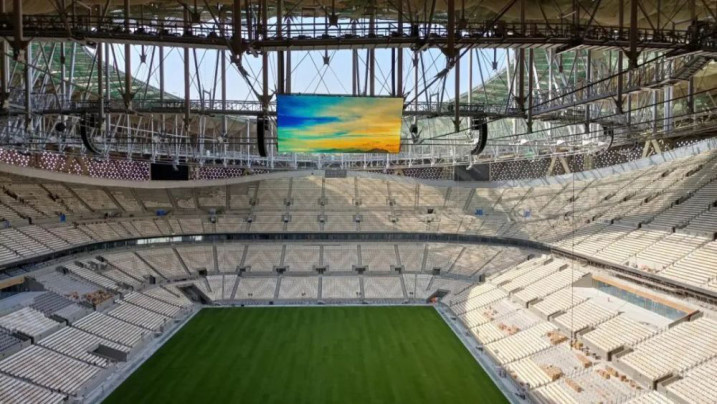 Photo shows a large LED display screen hanging in Lusail Stadium in Lusail, Qatar. The LED screen was produced by Unilumin Group Co., Ltd. headquartered in Shenzhen, south China's Guangdong province. (Photo/China Electronics News)
