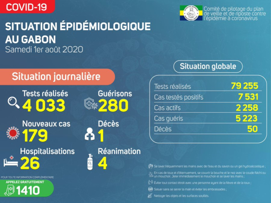 Tests réalisés : 4033 Nouveaux cas : 179 Hospitalisations : 26 Guérisons : 280 Décés : 1 Réanimation : 4