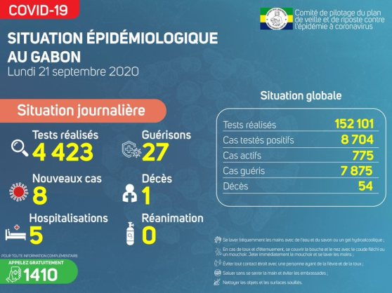 Tests réalisés : 4423 Nouveaux cas : 8 Hospitalisations : 5 Guérisons : 27 Décés : 1 Réanimation : 0