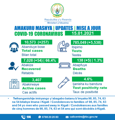 Bilan total : 10,573 (+257) Rétablis : 7,028 (+54) | 66.4% Cas actifs : 3,407 Testés : 785,049 (+5,538) Décés : 138 (+5) | 1.3% Taux de positivité : 4.6%