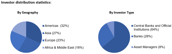 Cette nouvelle émission obligataire a généré une forte demande des investisseurs, avec un livre d’ordres atteignant 2,8 milliards de dollars, et ce à un niveau record contre l’obligation du Trésor américain de référence, car le plus serré jamais obtenu par la Banque sur une telle maturité. 53 investisseurs globaux, dont 7 nouveaux pour l’institution, ont participé à la transaction, avec une répartition diversifiée tant du point de vue géographique que par type d’investisseurs. La qualité exceptionnelle du carnet d’ordres s’illustre par la forte participation des banques centrales et institutions officielles, représentant ainsi près de deux tiers de l’allocation finale.