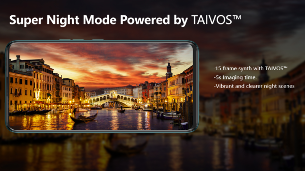Le système TAIVOS™ synthétise jusqu’à 15 images avec un temps de réponse de seulement 4,68 secondes alors que la plupart des autres smartphones réalisent cette performance en 5,5 secondes, voire 7 secondes. Les photographies prises avec TAIVOS™ sont construites à partir d’un ensemble de 15 prises de vue qui sont analysées puis recombinées pixel par pixel, pour donner vie de manière saisissante à chaque élément de vos images, avec un contraste optimal. Quelle que soit l’heure et la luminosité, cette technologie ravira les amateurs de photos, notamment pour leurs prises de vue de nuit lorsque les couleurs ont naturellement tendance à se fondre les unes dans les autres et à s'assombrir une fois la nuit tombée.