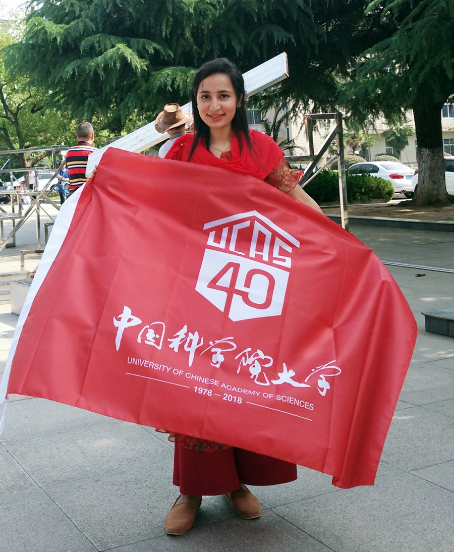Noor-ul-Huda holds a banner of University of Chinese Academy of Sciences. Photo: Courtesy of Noor-ul-Huda