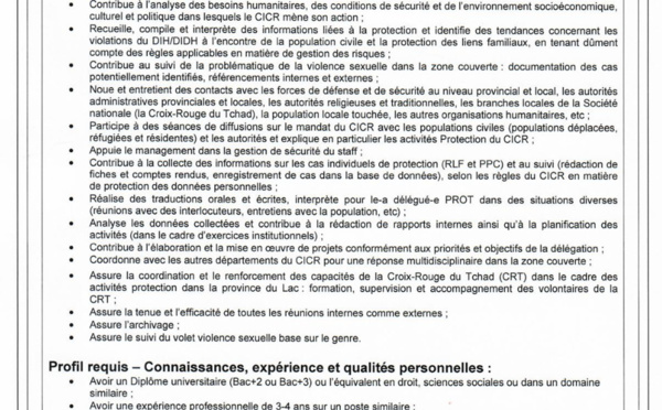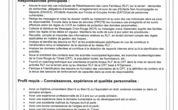 Tchad : La Délégation du CICR recrute un(e) Agent(e) de terrain de Rétablissement des Liens Familiaux (RLF) (H/F) basé(e) à N'Djamena