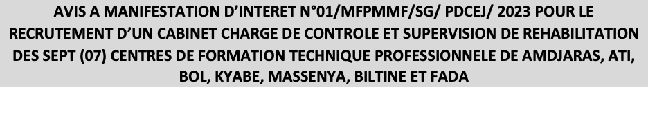 Le Gouvernement de la République du Tchad a obtenu un financement de l’Association Internationale de Développement (DON n° 4990 IDA) pour la mise en œuvre du Projet de Développement des Compétences pour l’Employabilité des Jeunes (PDCEJ). Il se propose d’utiliser une partie du montant de ces fonds pour effectuer des paiements autorisés au titre du contrat relatif au recrutement d’un cabinet chargé de contrôle et supervision de la réhabilitation des sept (07) Centres de Formation Technique et Professionnelle (CFTP) de : Amdjaras, Ati, Bol, Kyabe, Massenya, Biltine et Fada.
