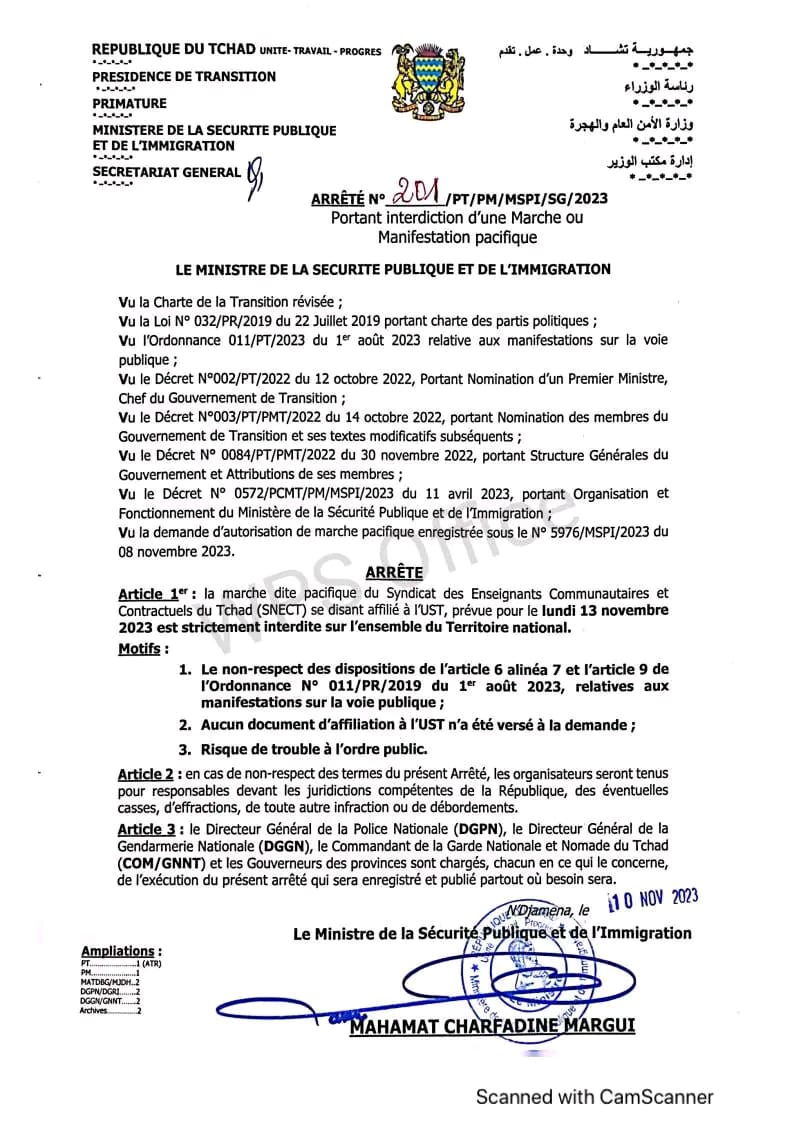 Tchad: La marche dite pacifique du SNECT est trictement interdite sur l'ensemble du territoire national.