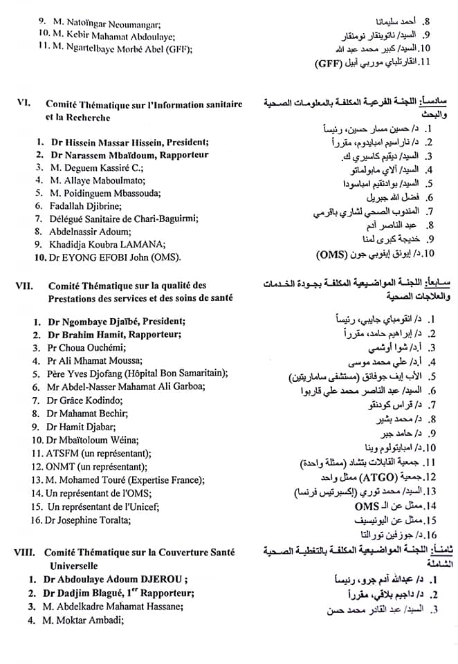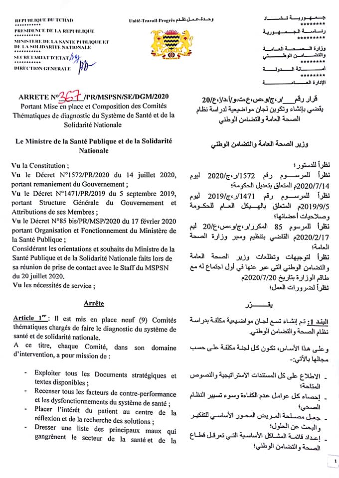 Le ministre de la Santé publique Dr. Abdoulaye Sabre Fadoul a signé le 27 juillet 2020 un arrêté portant mise en place et composition de neuf comités thématiques chargés de faire le diagnostic du système de santé et de la solidarité nationale.